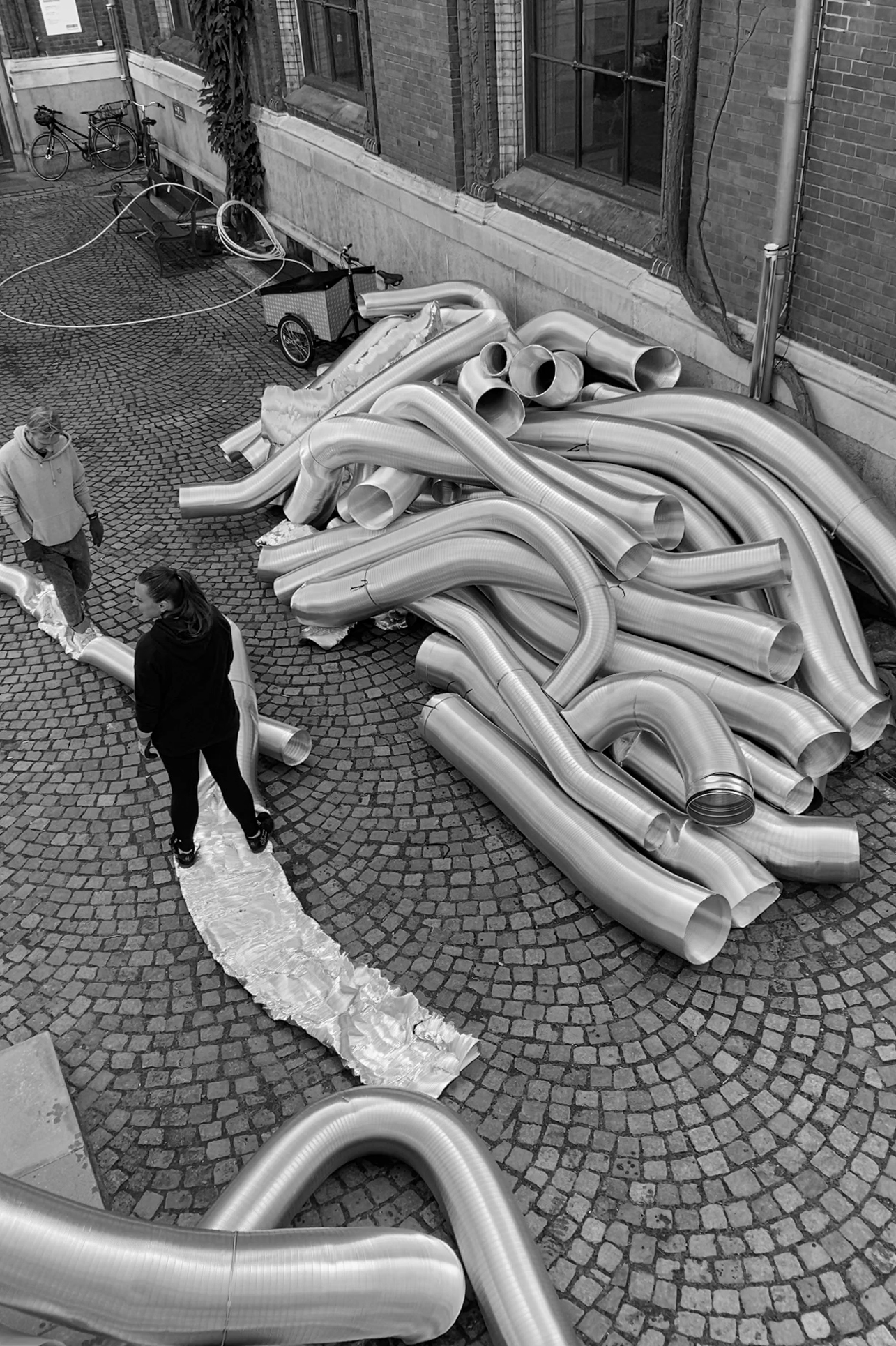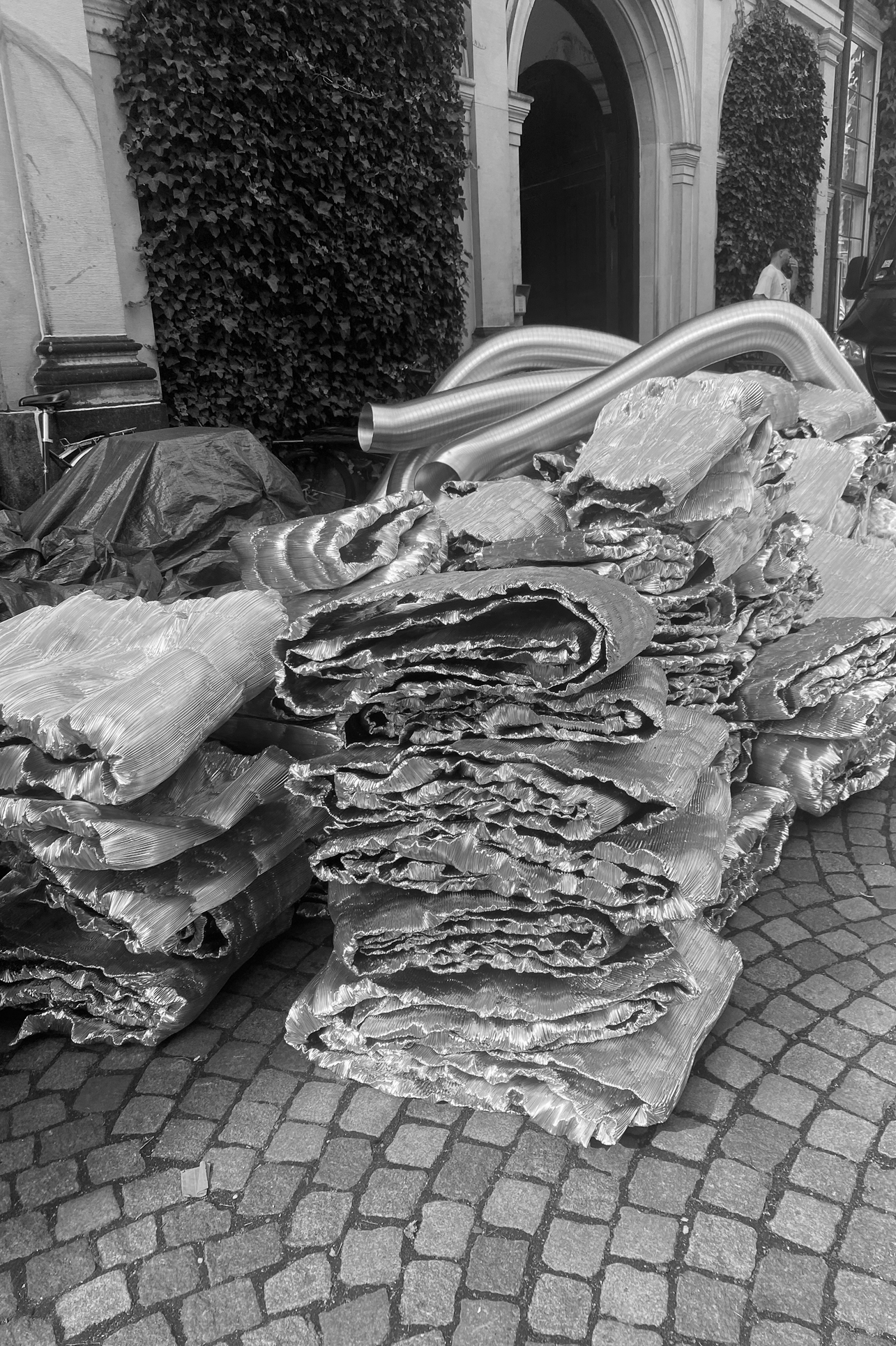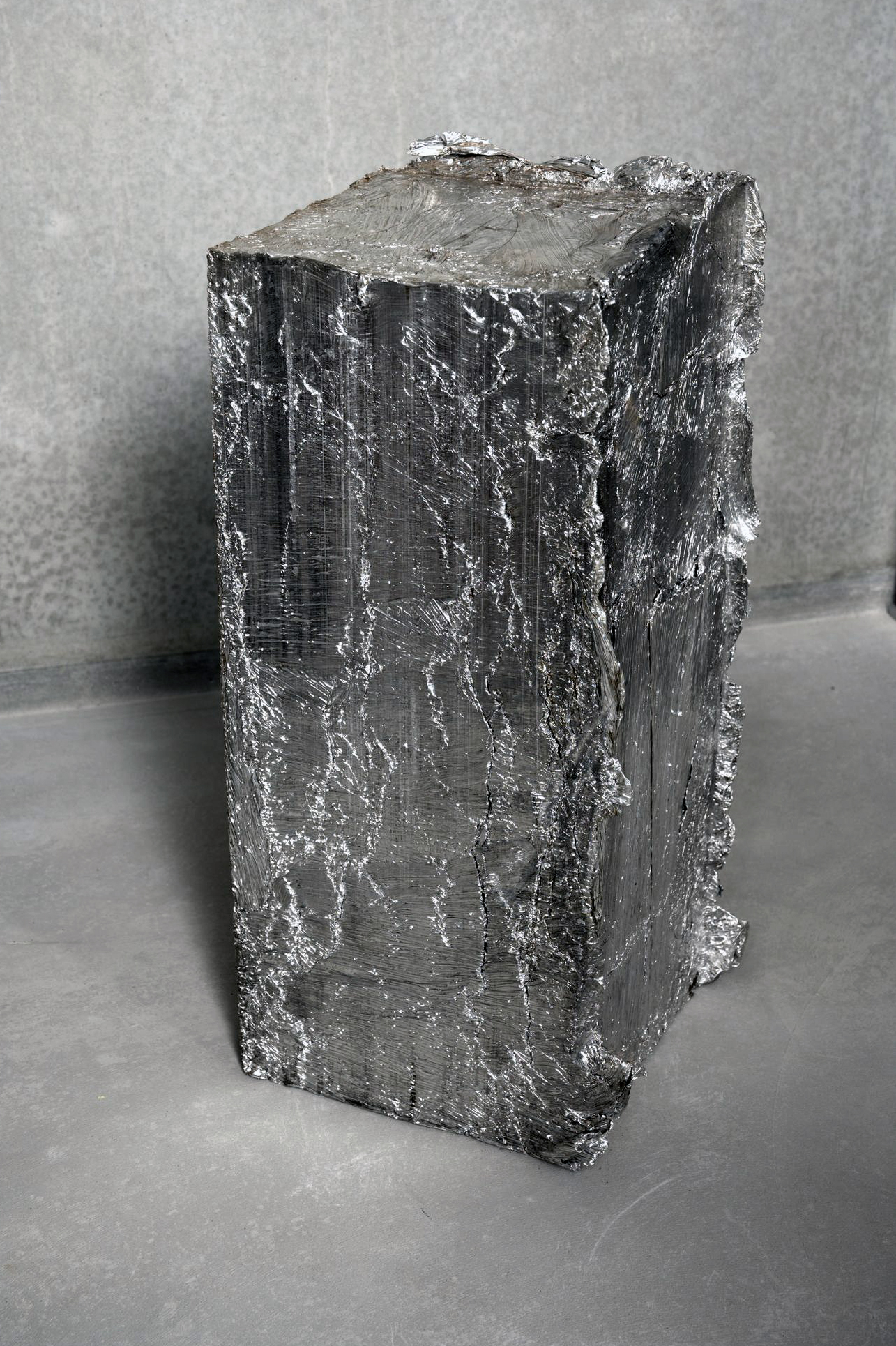 As a follow-up on OM feedback, the installation was compressed into aluminium blocks, transforming a light, flexible structure into dense, heavy yet movable polished volumes.